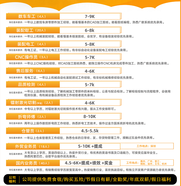 公司福利:工作環(huán)境優(yōu)美/提供免費(fèi)食宿/五險(xiǎn)/節(jié)假日有薪/全勤獎(jiǎng)/年底雙薪/假日福利。