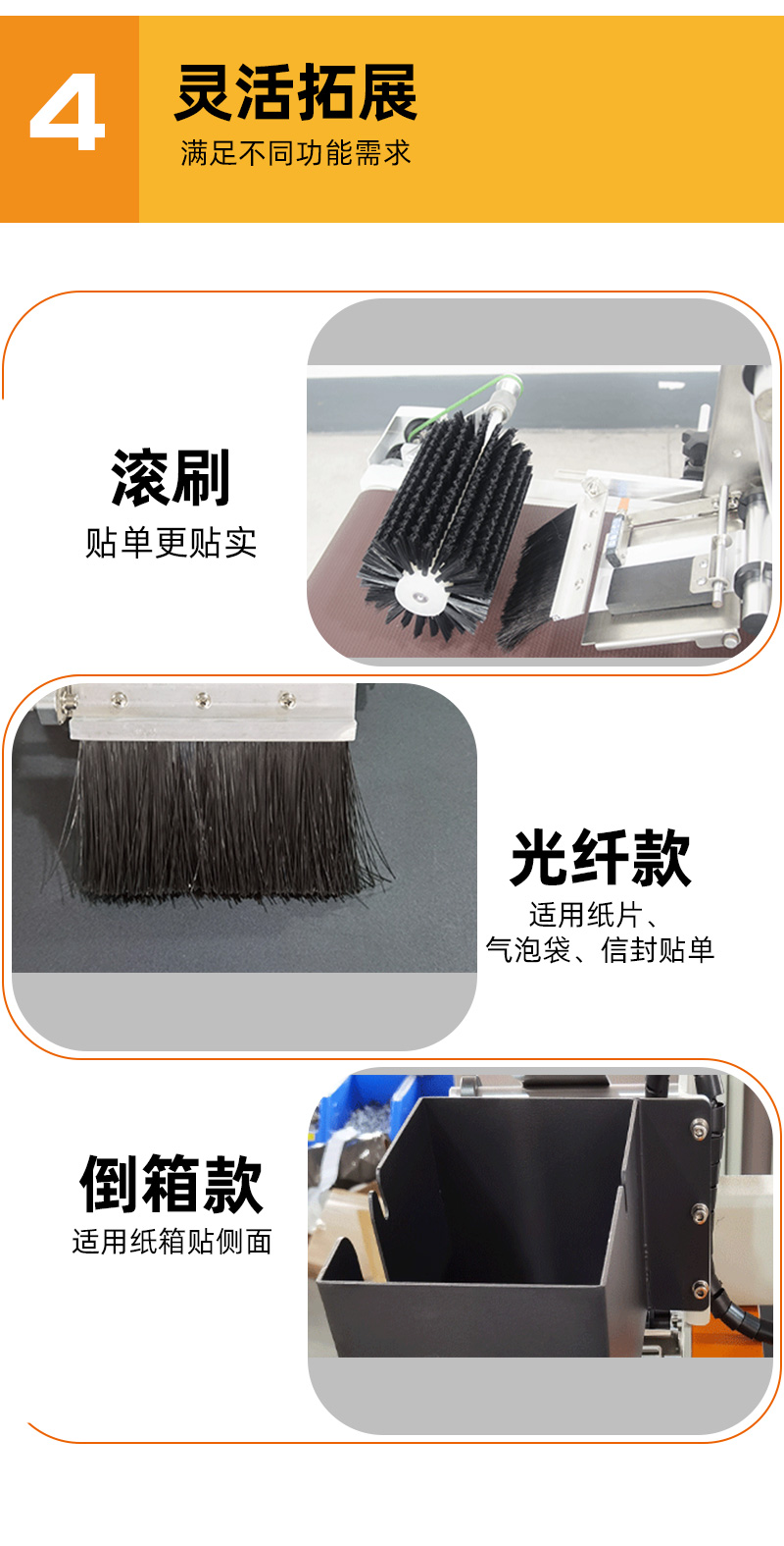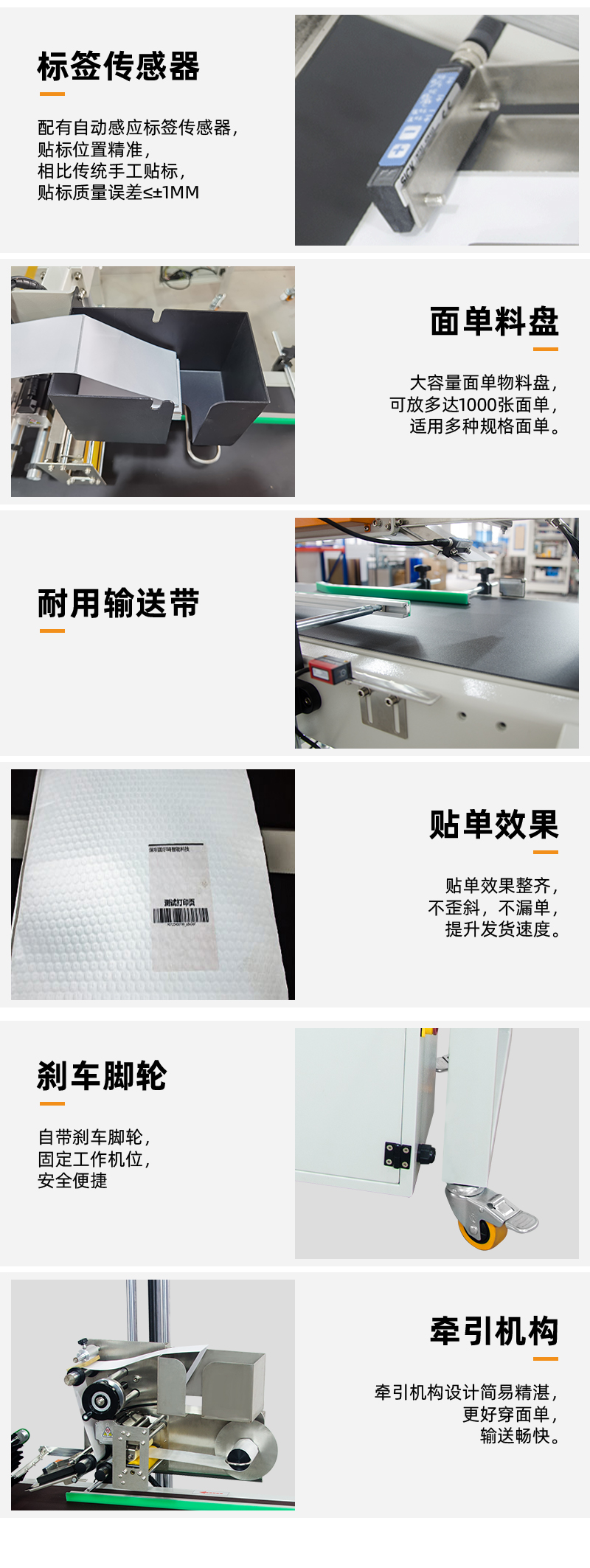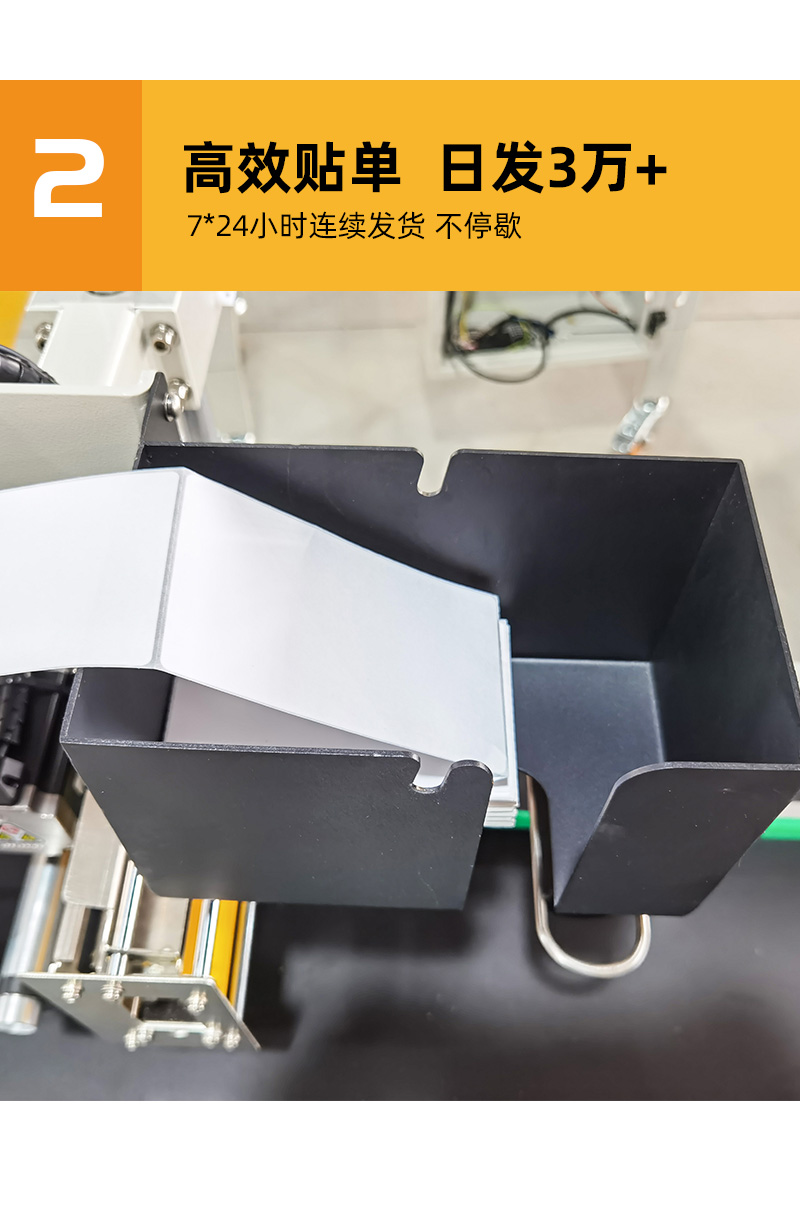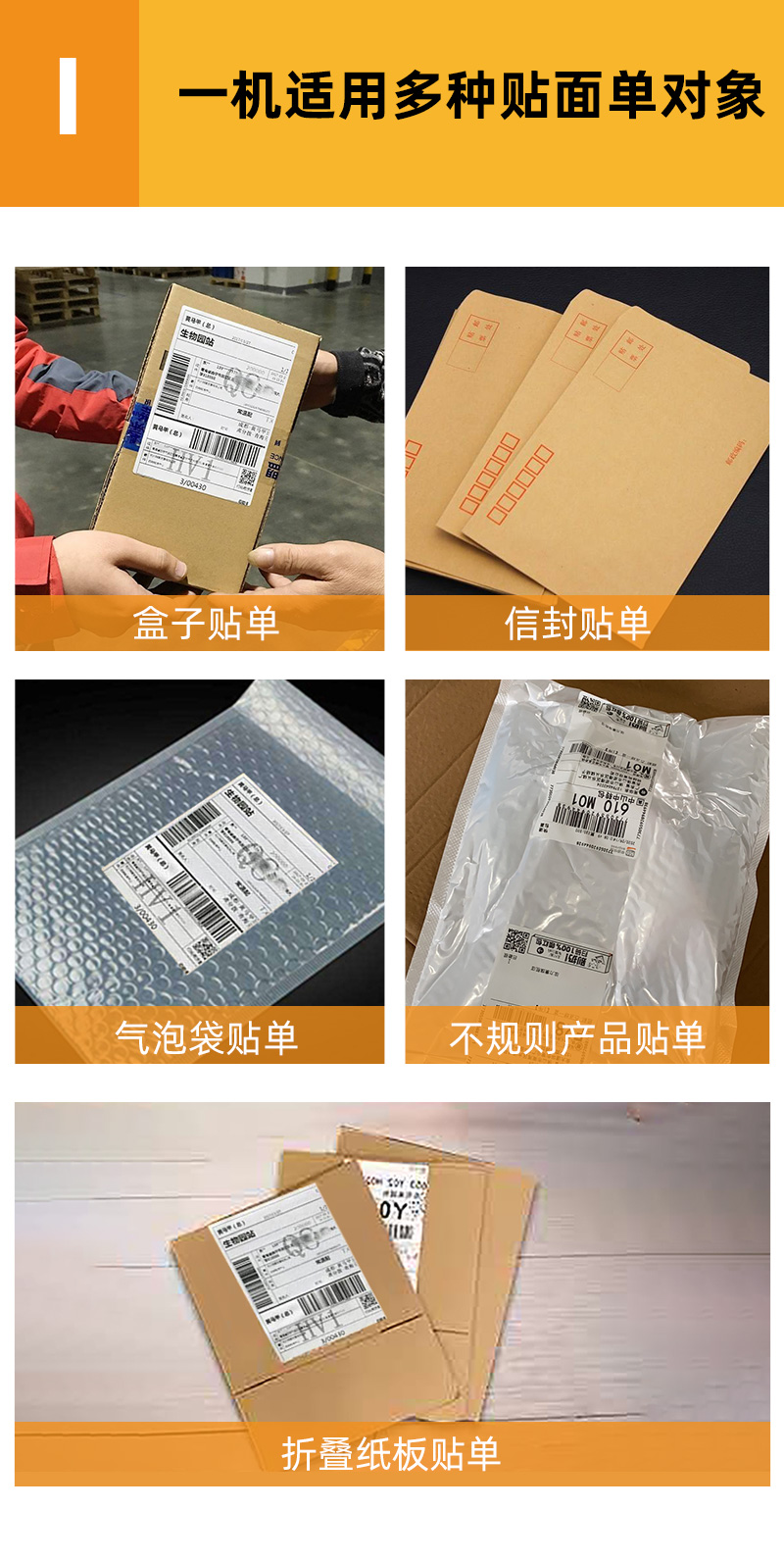 自動快遞貼單機是我司自主設計生產(chǎn)的一款24小時無人化連續(xù)貼單作業(yè)的設備,該機具有一鍵啟動,傻瓜式操作的特點,日貼3萬+,操作使用體驗更好。同時,該機針對信封等較薄的證件貼面單,設有光纖傳感器,方便更加快速貼單,適用于貼各種規(guī)格的大小紙箱、快遞面袋等,可實現(xiàn)打印快遞面單后,產(chǎn)品一邊輸送一邊貼單,貼單平實、貼單位置精準,不傾斜,精度誤差≤±1mm??蓡螜C使用也可配套封箱機使用,廣泛應用于倉儲、物流、電商等行業(yè)。