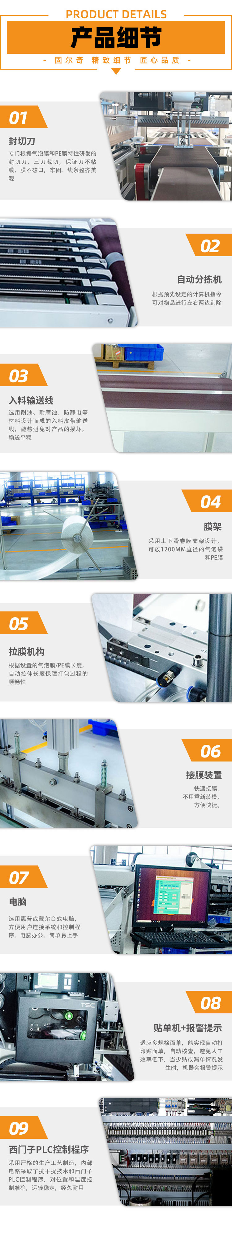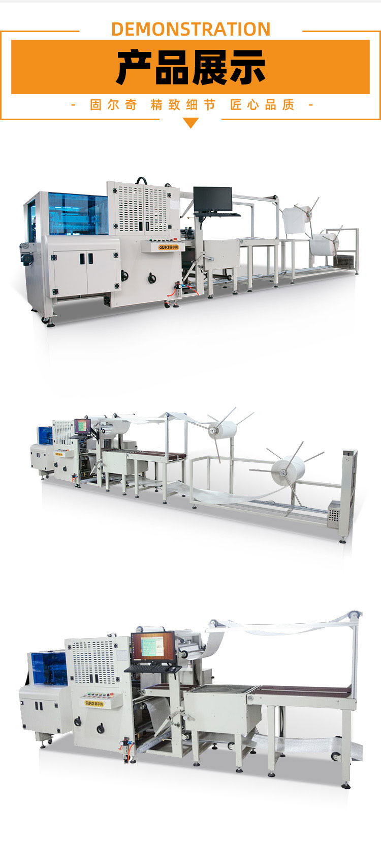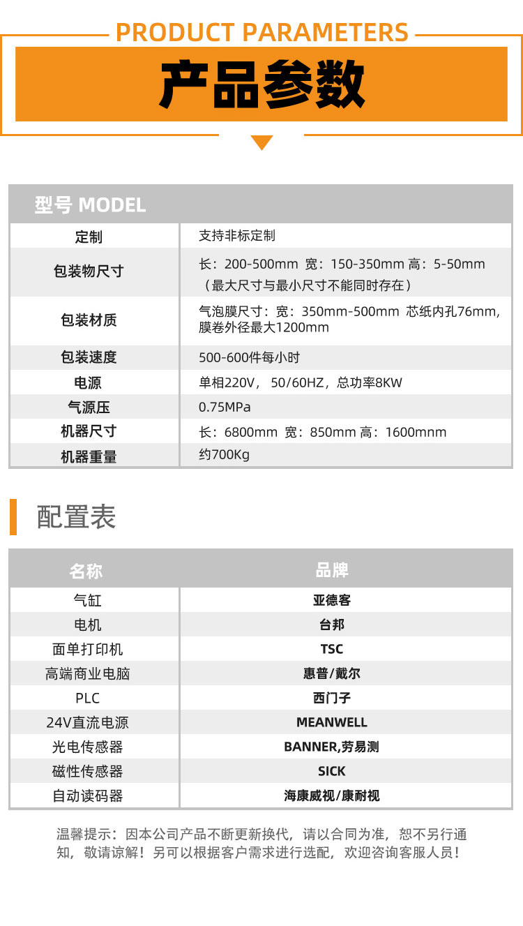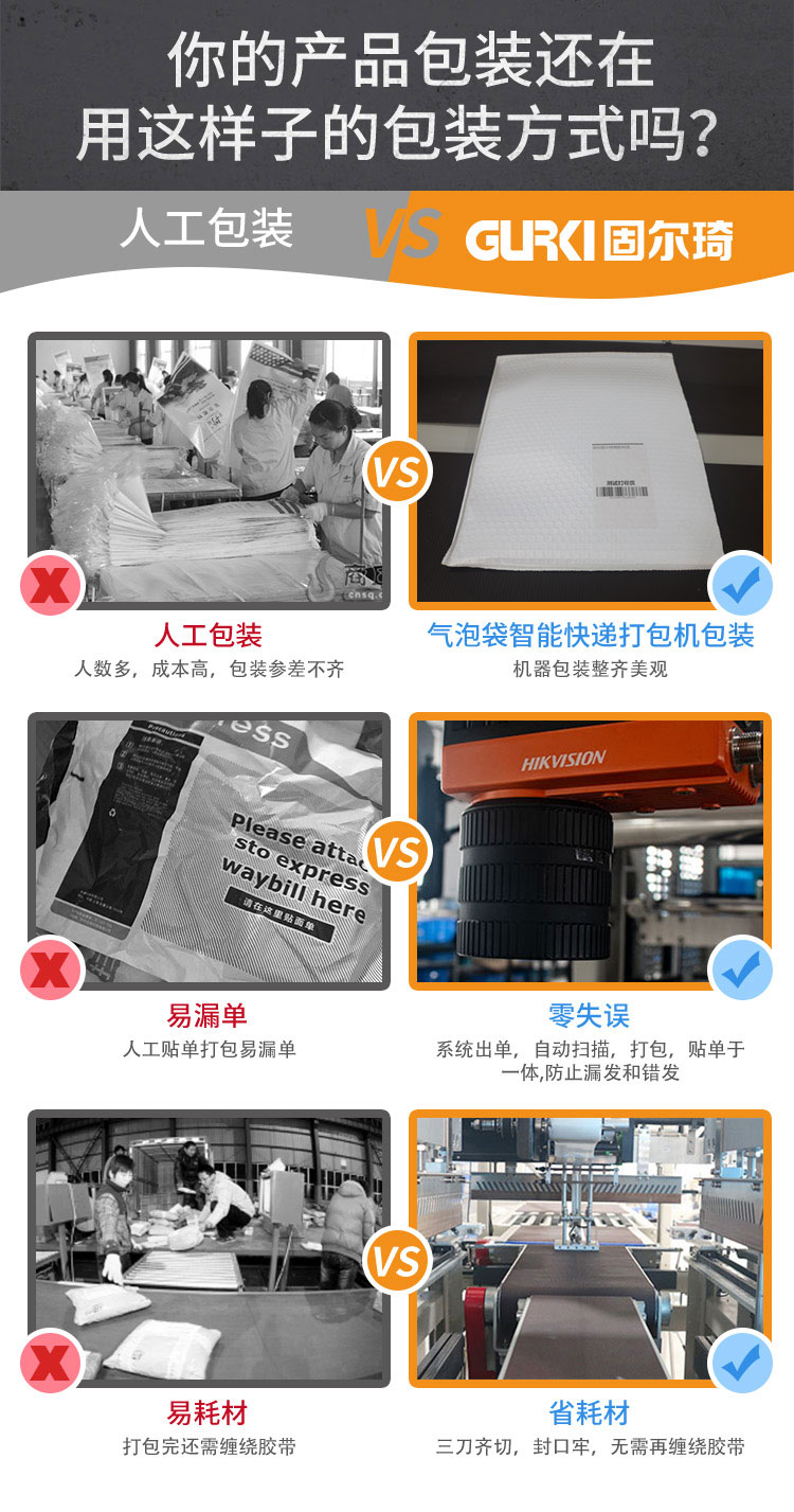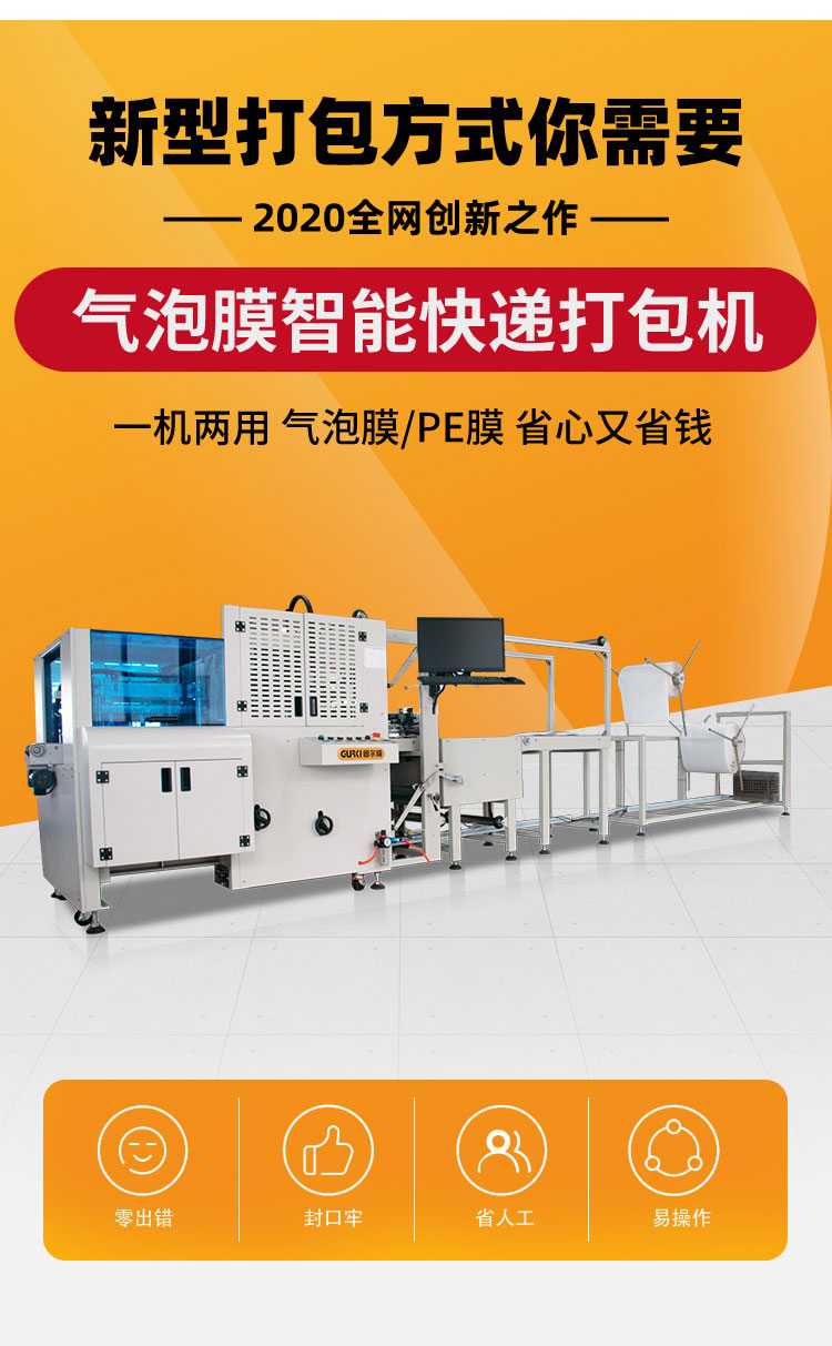 本產(chǎn)品為電商線上發(fā)貨環(huán)節(jié)設(shè)計的氣泡膜或PE膜專用快遞打包機,根據(jù)客戶需要,自動對接電商訂單WMS 系統(tǒng),提供自動識別產(chǎn)品信息、自動剔除、自動封口、自動貼面單和自動復核以及貨品自動輸送等一體化解決方案。