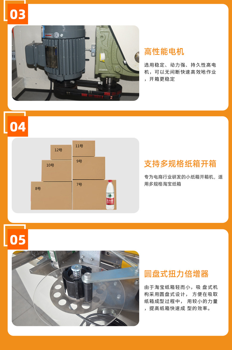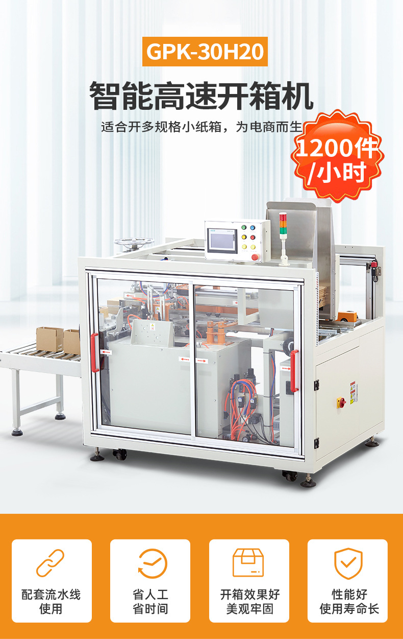 GPK-30H20 電商高速開箱機(jī)是專門為電商行業(yè)打造的小紙箱臥式快速成型的機(jī)器,吸箱、成形、折底、封底一次完成,開箱速度每分鐘20箱,能夠解決電商旺季打包數(shù)量多,包裝慢的問題,同時(shí)它不需要任何維護(hù),只要通電即可使用,可配套稱重、貼標(biāo)、掃碼、分揀機(jī)等設(shè)備使用或單機(jī)作業(yè)。