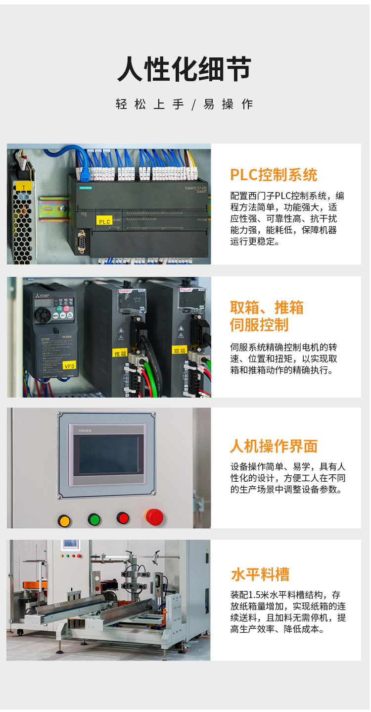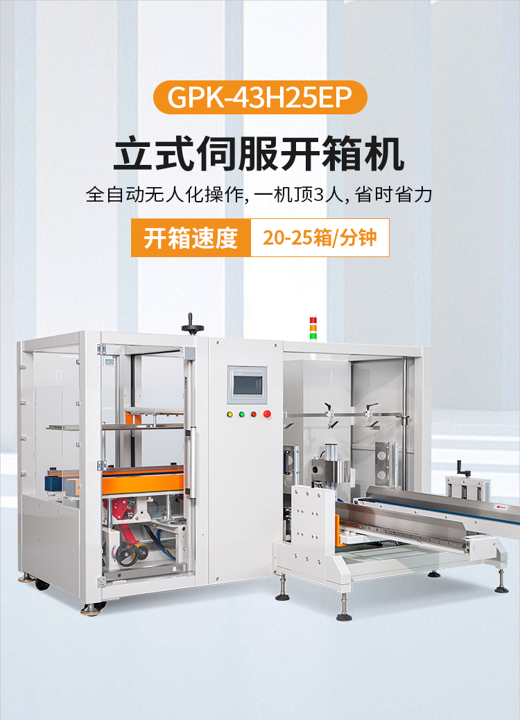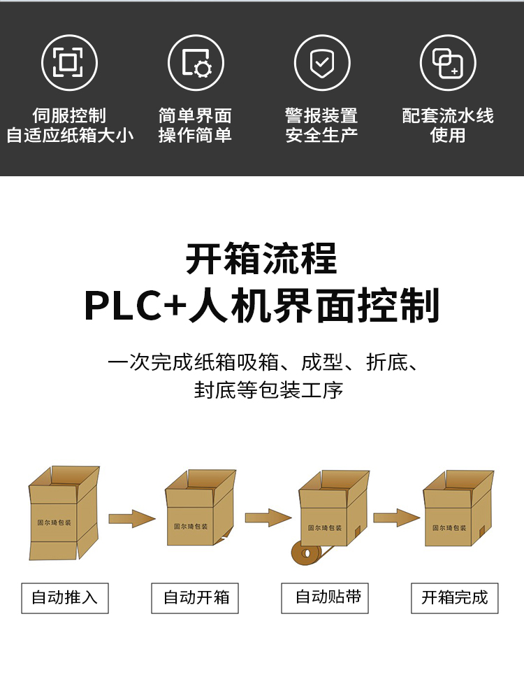 伺服開箱機是通過吸盤將紙箱板從料槽中吸取,實現(xiàn)紙箱板自動拉開成型、底部按一定程序折合成型,并用膠帶密封后輸送給裝箱機的專用設備,機器采用PLC+人機界面控制,折底不停留,輸送中自動完成折底、封底;同時完成吸箱、成型、折底、封底整 個過程,伺服可實現(xiàn)取箱與推箱部分一鍵切換調(diào)節(jié)。
