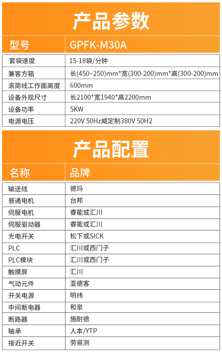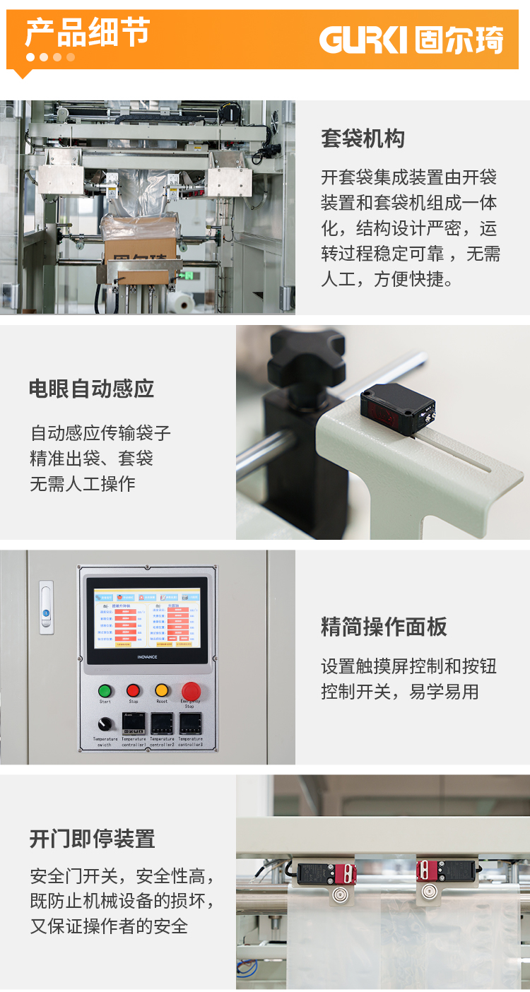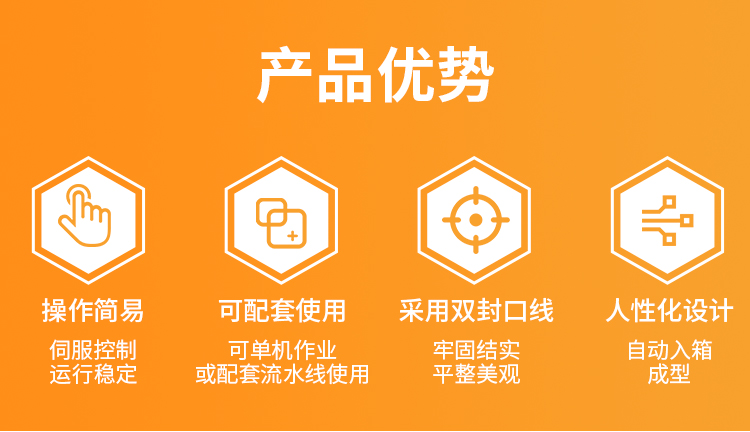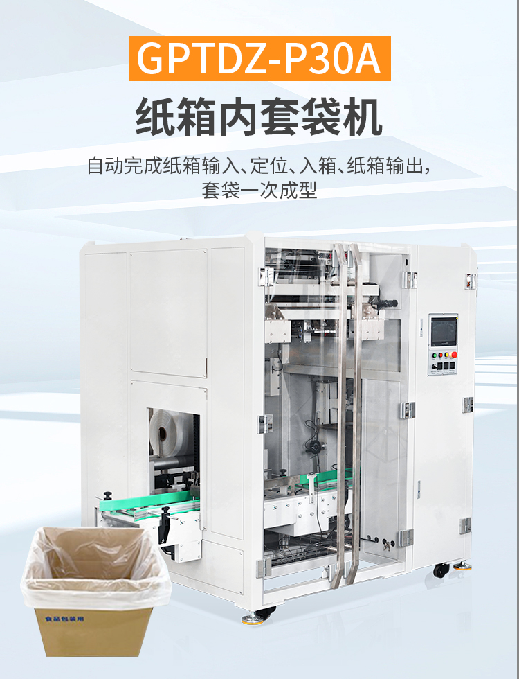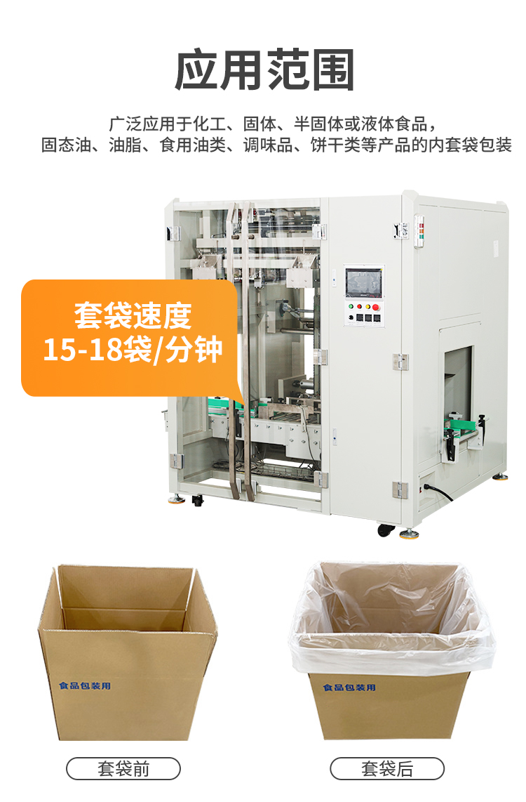 自動紙箱內(nèi)套袋機(jī),該機(jī)采用多伺服控制,自動完成紙箱輸入、定位、卷膜輸出、入箱、切膜、折邊、紙箱輸出。自動套袋一次同步成型,無需停機(jī),可銜接前段自動開箱機(jī),后段自動裝箱機(jī)、自動提袋封口機(jī)和自動封箱機(jī)實(shí)現(xiàn)無人化自動包裝。該款套袋機(jī)適用PE膜材質(zhì),運(yùn)用于化工、粉末、固體、半固體或液體;食品,固態(tài)油、油脂、食用油類、調(diào)味品、餅干、生鮮水果類等產(chǎn)品的內(nèi)套袋包裝。