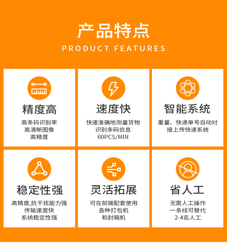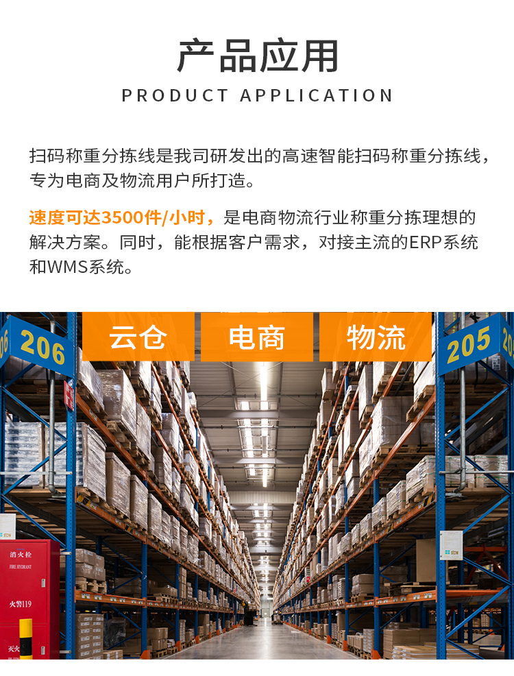 本產(chǎn)品是我司研發(fā)出的高速智能掃碼稱重分揀線,專為電商及物流用戶所打造。全線以高性能掃碼相機(jī),高速稱重機(jī)及擺輪分揀機(jī)為核心,集自動(dòng)掃碼,自動(dòng)稱重,自動(dòng)分揀,自動(dòng)攬收,錯(cuò)件自動(dòng)剔除等功能于一體。速度可達(dá)3500件/小時(shí)。是電商物流行業(yè)稱重分揀理想的解決方案。同時(shí),能根據(jù)客戶需求,對(duì)接主流的ERP系統(tǒng)和WMS系統(tǒng)。