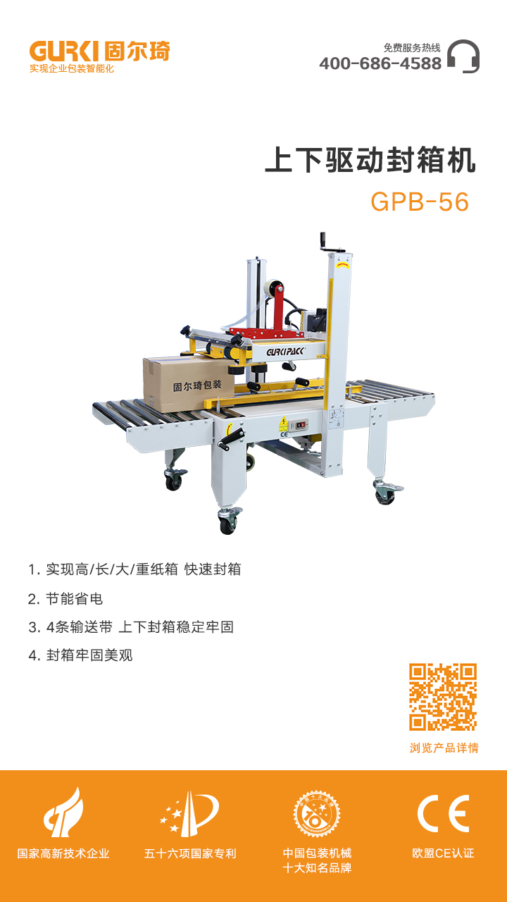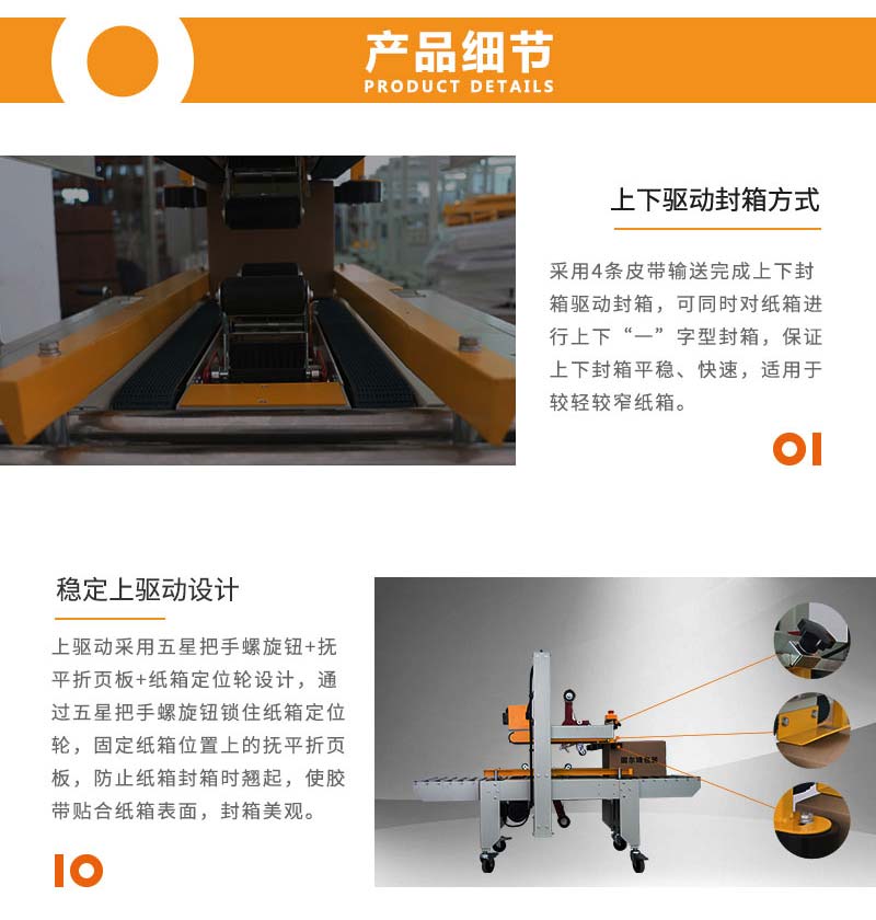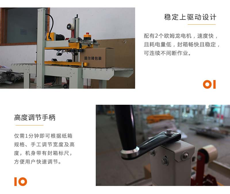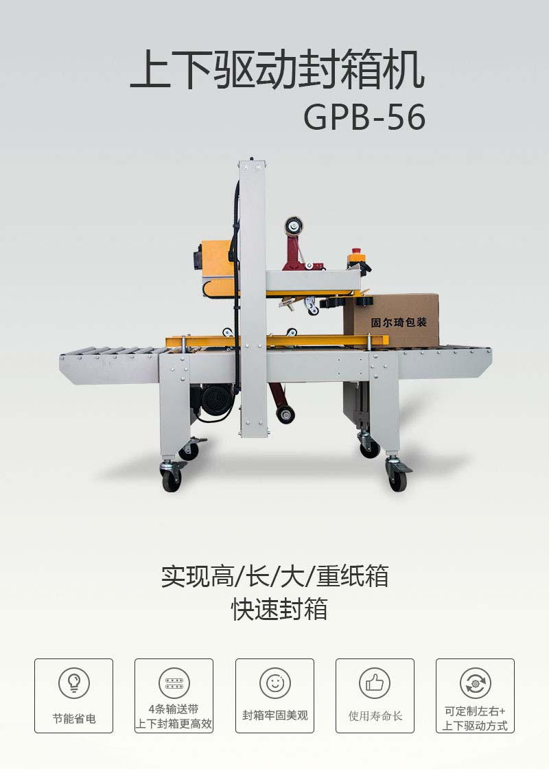 上下驅(qū)動封箱機上下皮帶驅(qū)動,適合輕型高箱;可同時對紙箱進行上下 “一”字型封箱,上下封箱平穩(wěn)、快速,適用于較輕較窄紙箱。 該款封箱機廣泛應(yīng)用于食品、醫(yī)藥、飲料、煙草、日化、汽車、線纜、電子等行業(yè)。