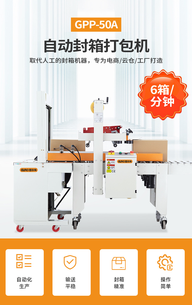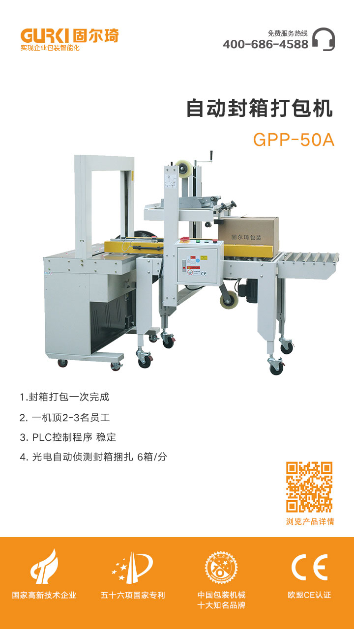 自動封箱打包機GPP-50A的配套,使全自動打包機和自動封箱機為一體的包裝機,可配套自動化包裝流水線使用,自動上下封膠帶,多道困扎,實 現(xiàn)后道無人化包裝;工作效率高,更好滿足新老顧客的需求。廣泛適應于印刷、彩繪、賀卡、相冊、相框、醫(yī)藥、電子、日化、 化妝品等大批量生產(chǎn)的行業(yè)。