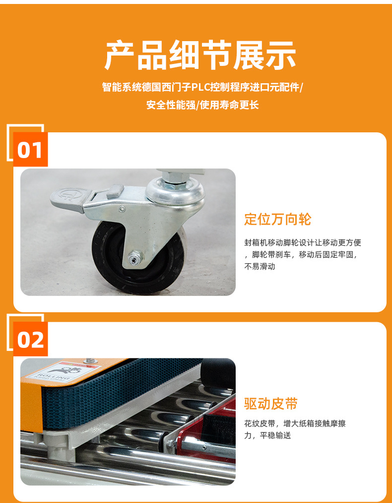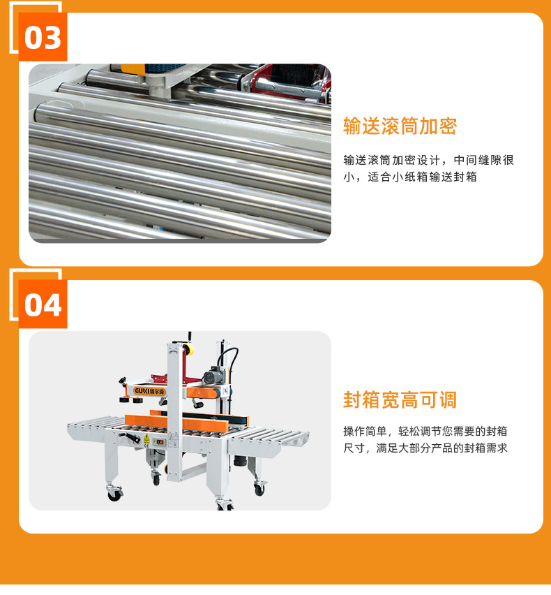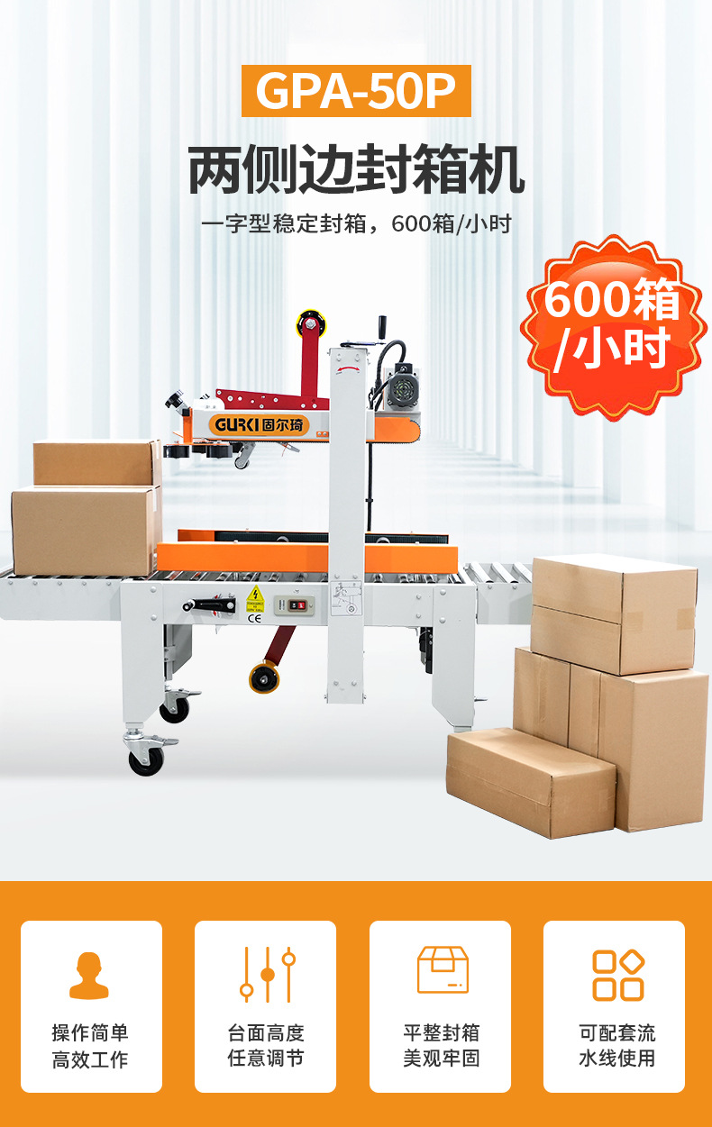 左右+上下驅(qū)動(dòng)封箱機(jī)GPA-50P采用即貼膠帶封紙箱封口,經(jīng)濟(jì)快速、容 易調(diào)整,可一次完成上、下封箱動(dòng)作,也可以采用印字膠帶,更可提高產(chǎn) 品形象,體積輕巧,滑輪相輔,位移甚為靈活,更加方便安裝與調(diào)試。 該款封箱機(jī)廣泛應(yīng)用于食品、醫(yī)藥、玩具、煙草、日化、電子等國(guó)內(nèi)外各 行業(yè)。