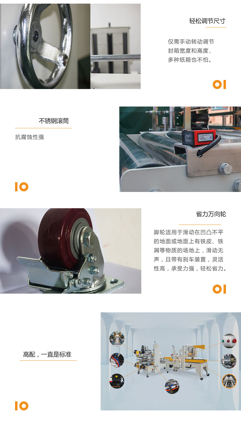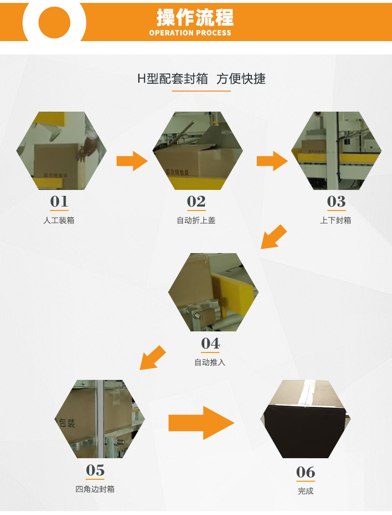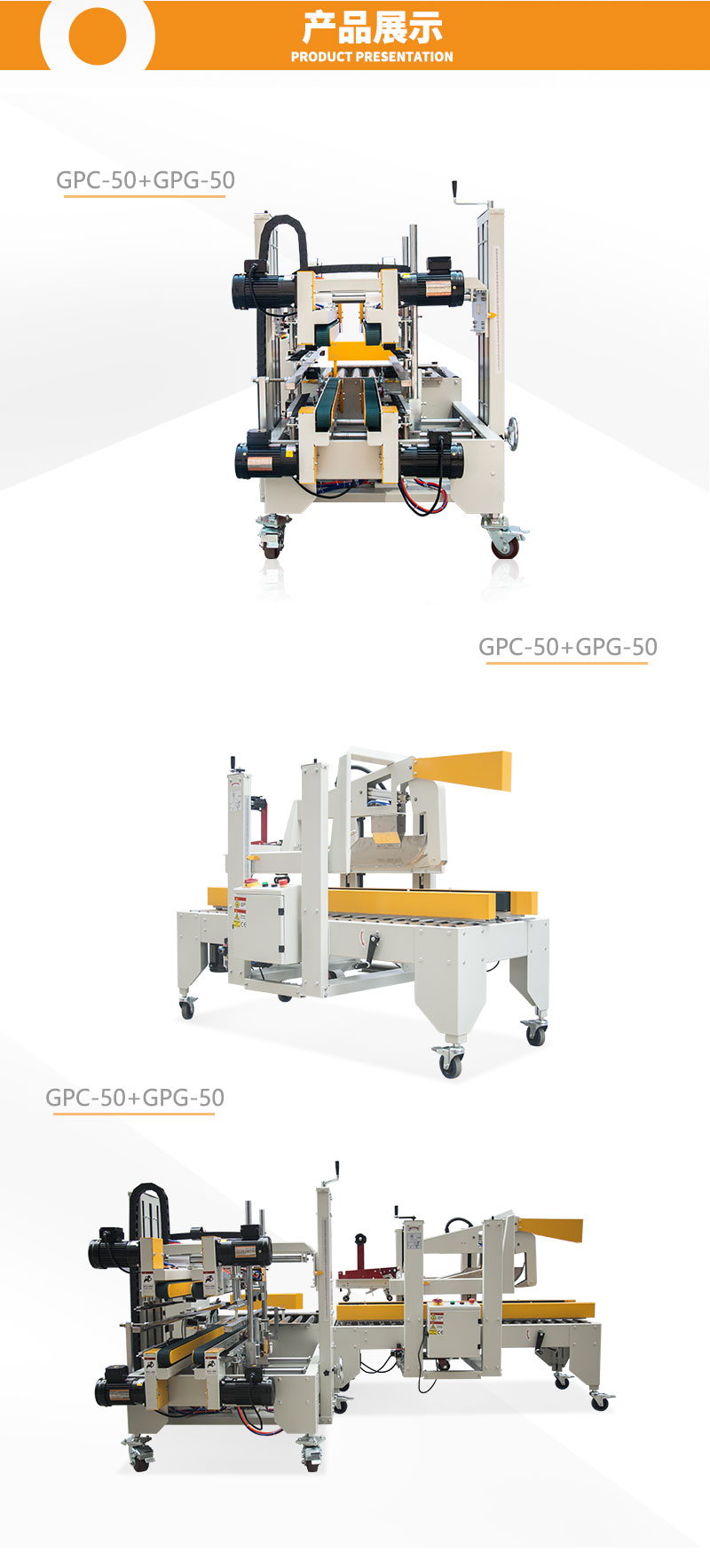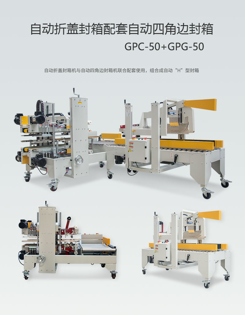 GPC-50+GPG-755E是自動折蓋封箱機(jī)與自動四角邊封箱機(jī)聯(lián)機(jī)配套,形成自動“H”型封箱,能自動折合頂蓋,輸送紙箱,上下“一”字型封箱,兩側(cè)輔助輪協(xié)助機(jī)器封箱,保證膠紙不貼歪。緊接著通過L型轉(zhuǎn)角推送,輸送進(jìn)紙箱進(jìn)行四角邊封箱作業(yè),簡單實(shí)用。該款封箱機(jī)廣泛應(yīng)用于食品、醫(yī)藥、飲料、煙草、日化等行業(yè)。
