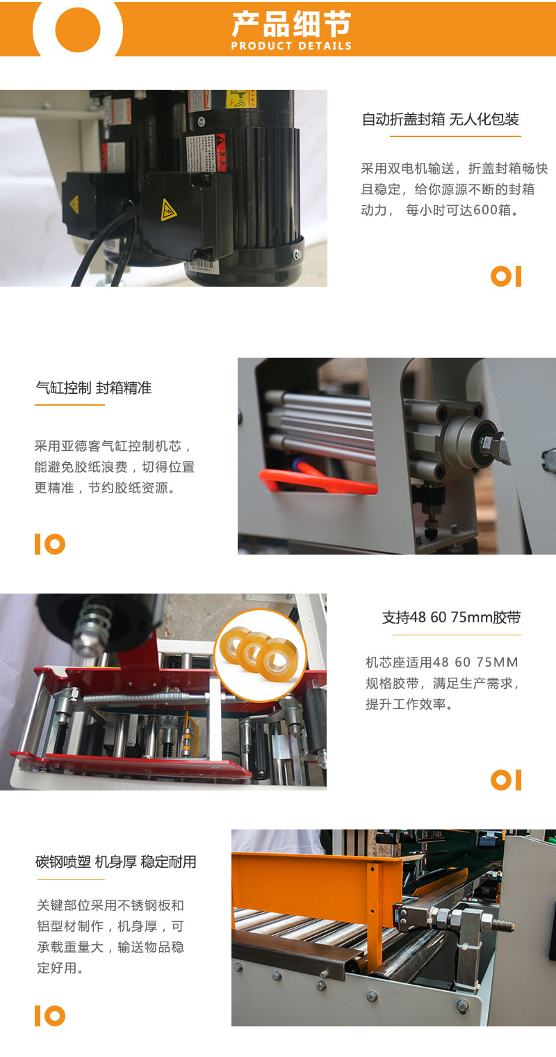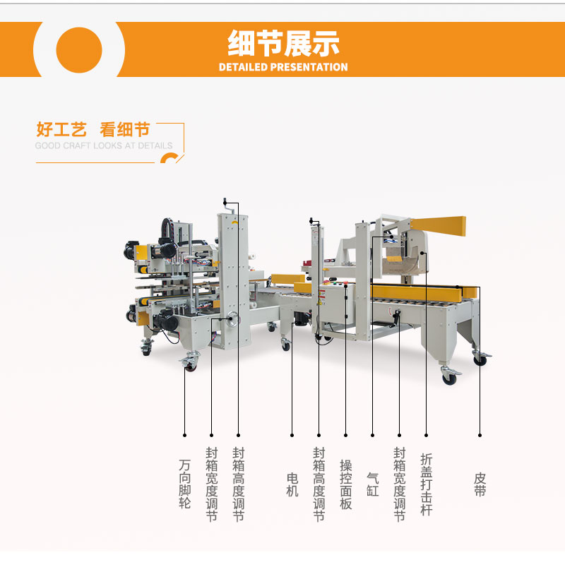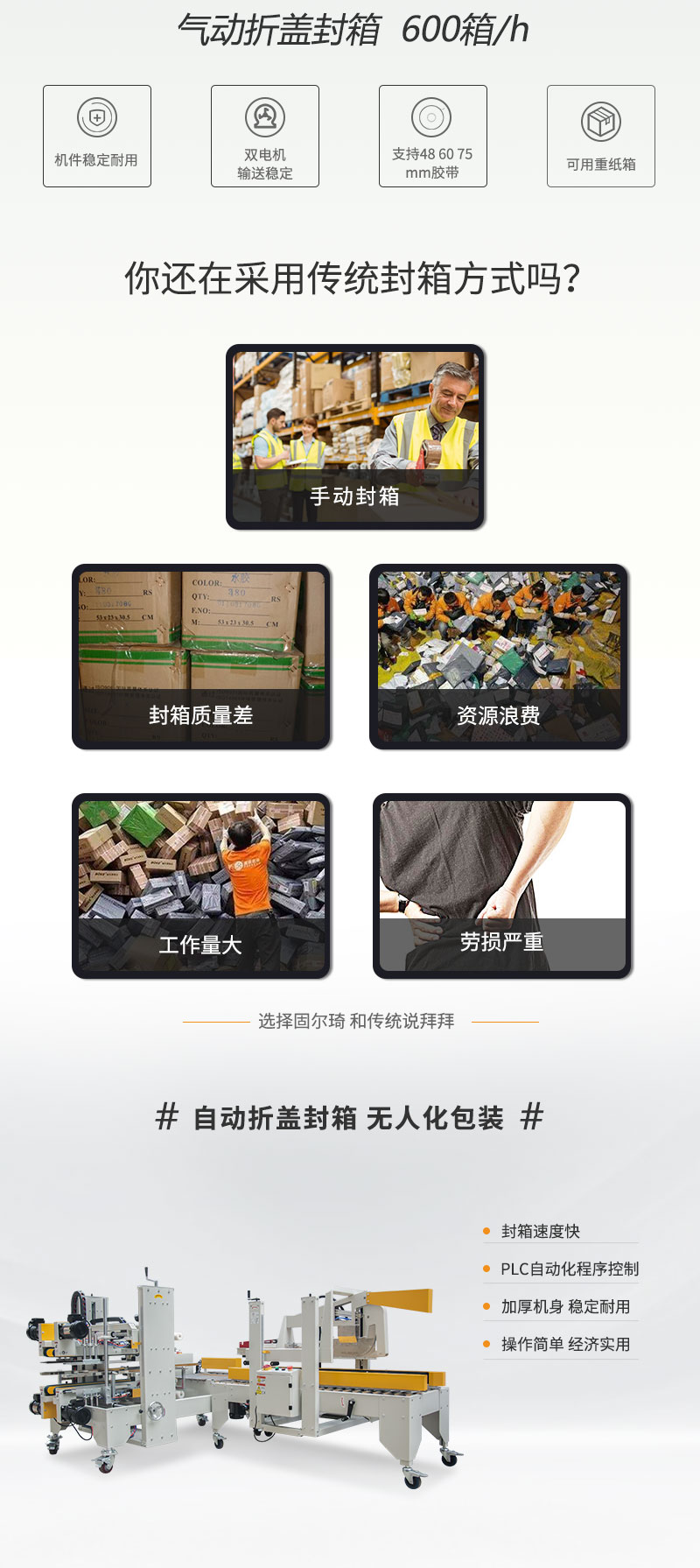 GPC-50+GPG-755E是自動折蓋封箱機(jī)與自動四角邊封箱機(jī)聯(lián)機(jī)配套,形成自動“H”型封箱,能自動折合頂蓋,輸送紙箱,上下“一”字型封箱,兩側(cè)輔助輪協(xié)助機(jī)器封箱,保證膠紙不貼歪。緊接著通過L型轉(zhuǎn)角推送,輸送進(jìn)紙箱進(jìn)行四角邊封箱作業(yè),簡單實(shí)用。該款封箱機(jī)廣泛應(yīng)用于食品、醫(yī)藥、飲料、煙草、日化等行業(yè)。