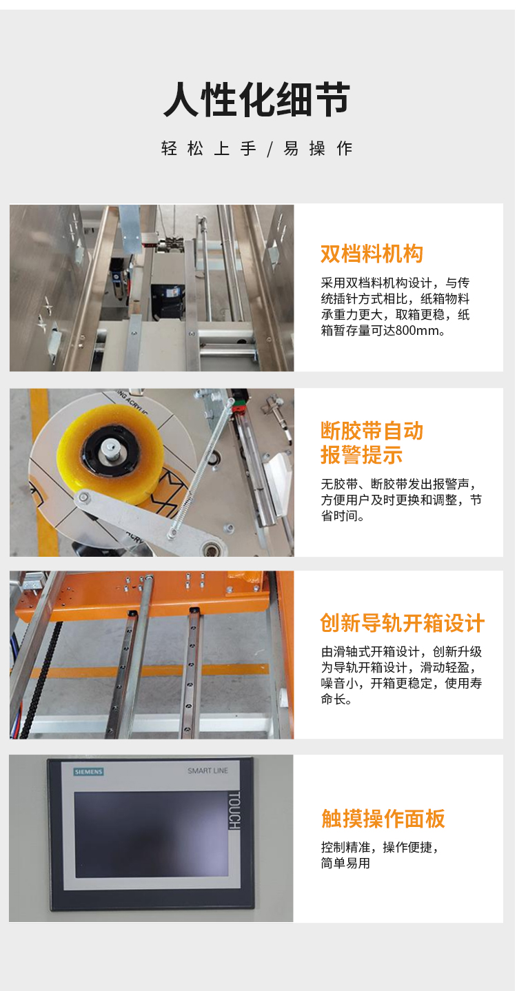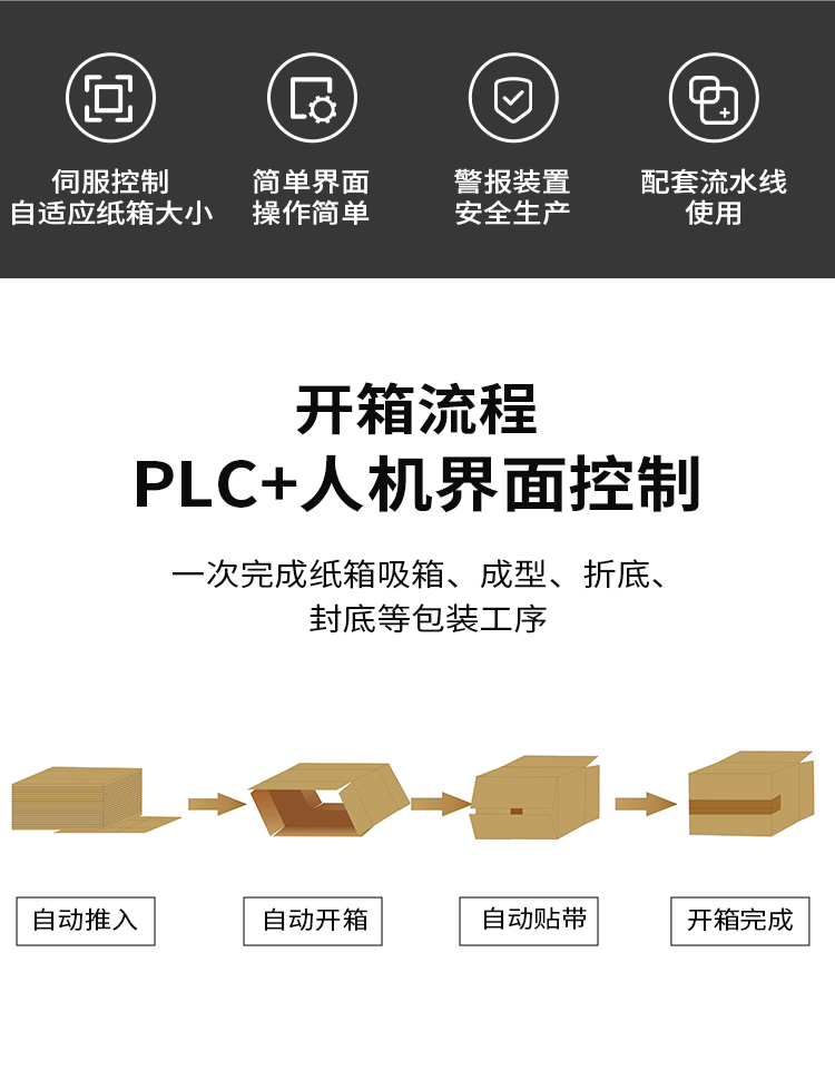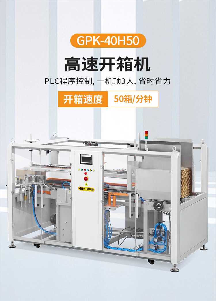 高速開(kāi)箱機(jī)GPK-40H50是本公司自主生產(chǎn)設(shè)計(jì)的產(chǎn)品,臥式開(kāi)箱速度達(dá)到50箱/分鐘的高速開(kāi)箱機(jī),高性價(jià)比配置,使用壽命長(zhǎng),經(jīng)濟(jì)實(shí)惠。 該款開(kāi)箱機(jī)廣泛應(yīng)用于食品、醫(yī)藥、飲料、煙草、日化、電子等各行業(yè)。